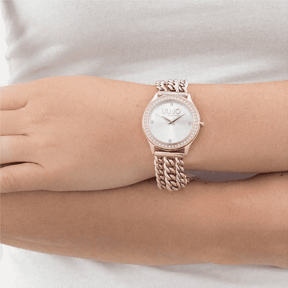 OROLOGIO IN ACCIAIO CON TRARTTAMENTO IN PVD ROSE' MOVIMENTO AL QUARZO , FONDO CON CHIUSURA A SCATTO ,GIRO GHIERA DI CRISTALLI BIANCHI , VETRO MINERALE. DIAMETRO 35 MM.