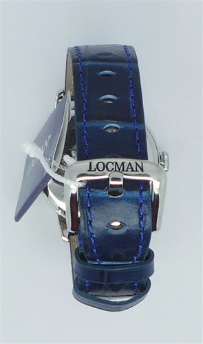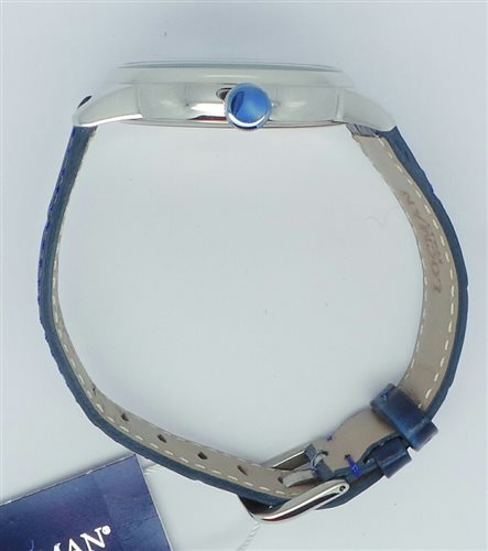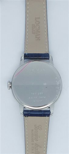 Orologio unisex , movimento al quarzo , solo tempo , cassa mm 40 , quadrante blu , indici incollati , fondello in titanio a pressione , numero seriale di produzione inciso sul fondo , vetro con trattamento zaffiro , cinturino in pelle stampata blu. Immagine indicativa , la confezione può variare di forma e colore.
