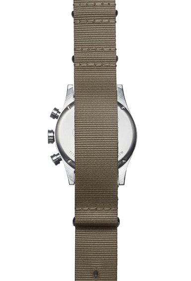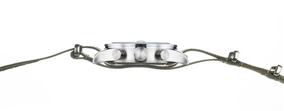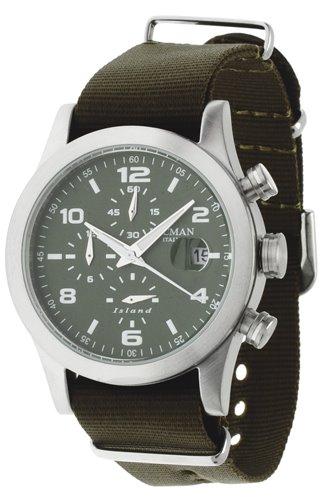 Serie Island Movimento quarzo analogico Funzione cronografo Datario con lente ingrandimento Cassa in acciaio /titanio 40mm Quadrante nero Finitura quadrante effetto sunray, vetro minerale con trattamento zaffiro Corona a vite Cinturino in nylon verde oliva con chiusura ad ardiglione Impermeabilità 5 atmosfere