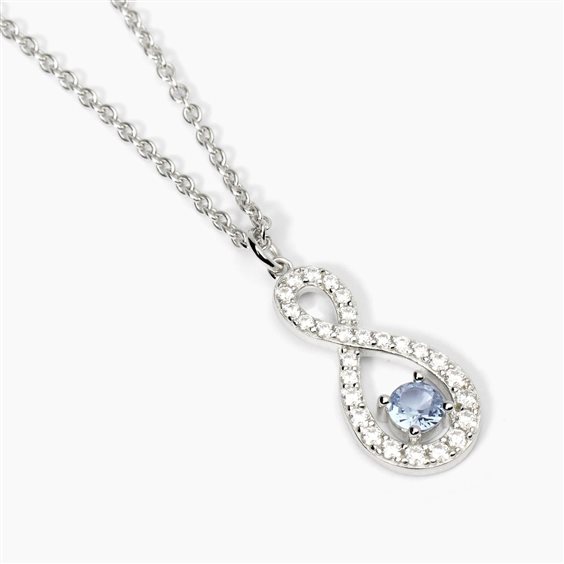 Girocollo in argento con infinito e acquamarina sintetica Girocollo regolabile da donna in argento rodiato con catena forzatina. Pendente a forma di infinito con acquamarina sintetica e zirconi bianchi. • Larghezza della catena forzatina: 1,5 mm • Dimensione del pendente: 9,5 x 18 mm • Diametro acquamarina sintetica: 4 mm • Diametro degli zirconi bianchi: 1,5 e 1,25 mm • Lunghezza regolabile da 40 a 45 cm • Materiale: Argento 925, Acquamarina sintetica, Zirconi